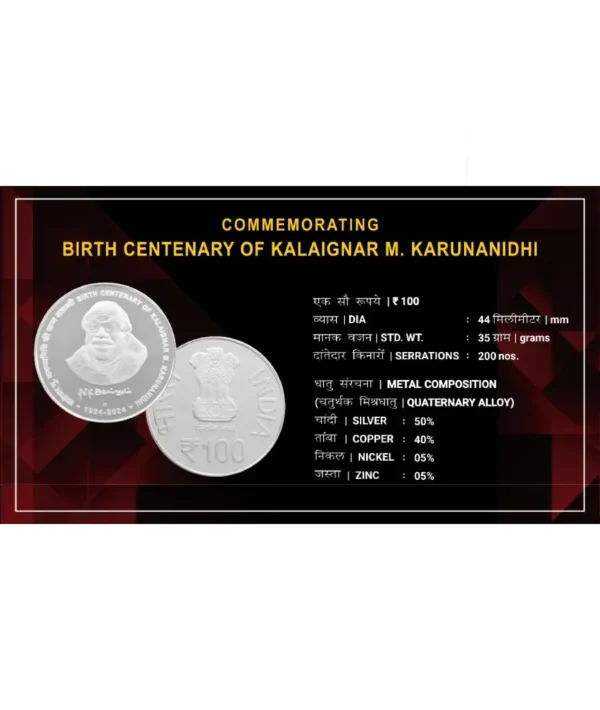 This limited-edition coin honors the life and legacy of Kalaignar M. Karunanidhi (1924–2024), symbolizing his immense contribution to literature, politics, and Tamil culture.
